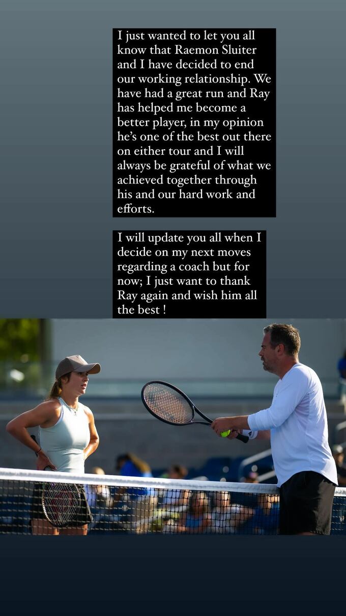 «Я хотіла повідомити вам усім, що ми з Рамоном Слейтером вирішили припинити наші робочі відносини. Ми чудово провели час, і він допоміг мені стати кращим гравцем. На мою думку, він один із найкращих спеціалістів у тенісі, і я завжди буду вдячна за те, чого ми досягли разом завдяки його і нашим спільним наполегливим зусиллям.
