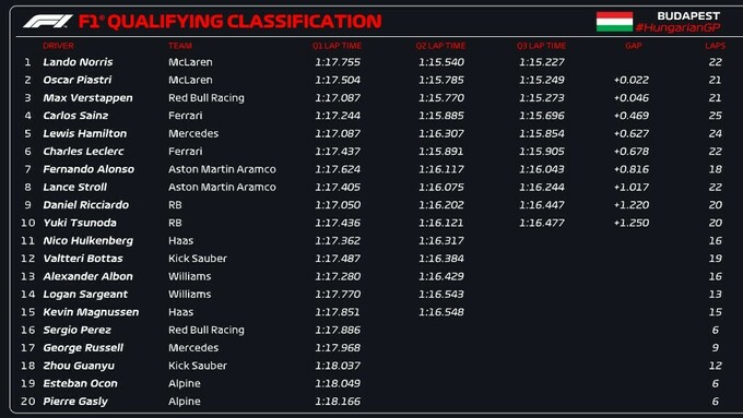 Відбулася кваліфікація у рамках гран-прі Формули-1 в Угорщині. Поул завоював пілот Макларена Ландо Норріс, який у своїй найкращій спробі випередив напарника Оскара Піастрі на 0,022 секунди. Топ-3 замкнув Макс Ферстаппен.