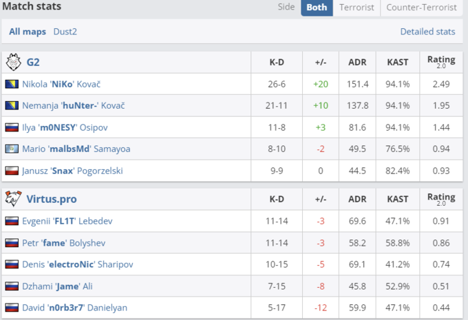 Першою картою у протистоянні був пік Virtus.pro – Dust 2. Незважаючи на впевнений старт від «ведмедів» у вигляді 3:0, G2 зуміли перевернути хід зустрічі і забрати першу половину з рахунком 9:3. У підсумку вони забрали і карту з рахунком 13:5.