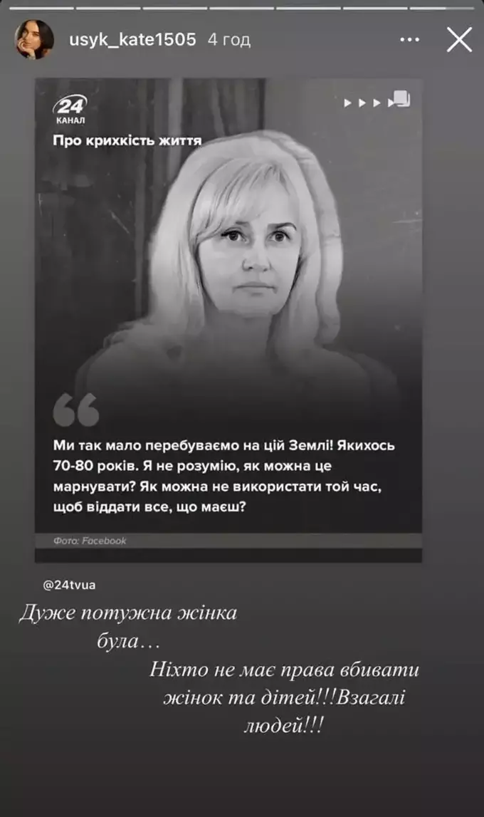 «Дуже потужна жінка була… Ніхто не має права вбивати жінок та дітей! Взагалі людей!» – написала Катерина Усик в інстаграмі.