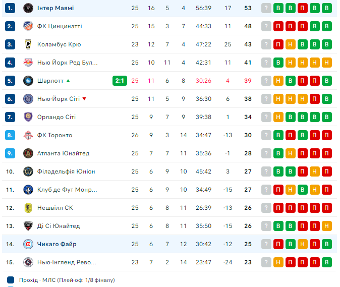 «Інтер Маямі» продовжує лідирувати в чемпіонаті, випереджаючи «Цинциннаті» на п'ять очок.