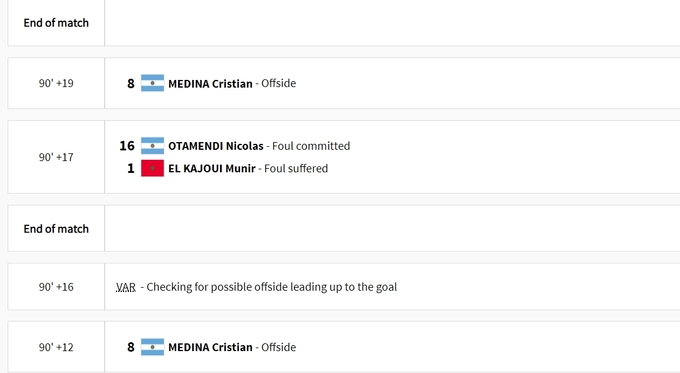 У результаті після матчу було вирішено скасувати гол збірної Аргентини через офсайд та дограти три хвилини. Команди о 20:00 вийшли на поле, зіграли три хвилини, відзначились двома фолами та завершили зустріч.