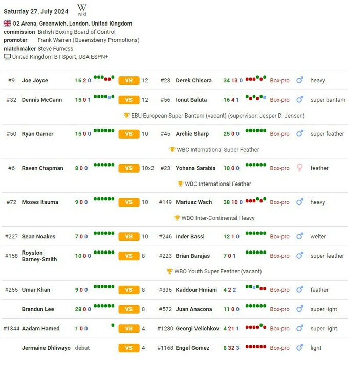 - Джо Джойс (16–2, 15 KO) – Дерек Чісора (34–13, 23 KO)