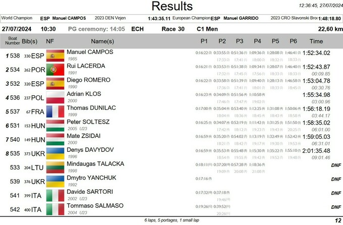 У гонці на каное-одиночках Давидов фінішував із відставанням у 9 хвилин від переможця Мануеля Кампоса. Іспанець у боротьбі за перше місце на 10 секунд випередив Руя Ласерду з Португалії. Замкнув подіум ще один іспанський каноїст Дієго Ромеро, який відстав від Кампоса на пів хвилини.