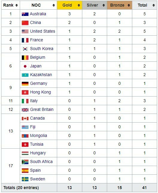 Лідирує в медальному заліку Австралія, яка має 5 нагород (3 золоті та 2 срібні). До топ-3 також входять Китай (2–0–1) та США (1–2–2).
