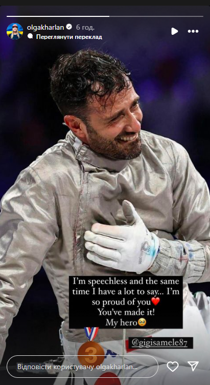 Українська фехтувальниця Ольга Харлан привітала свого хлопця італійця Луїджі Самеле зі здобуттям бронзової медалі на Олімпійських іграх у Парижі 2024 року.