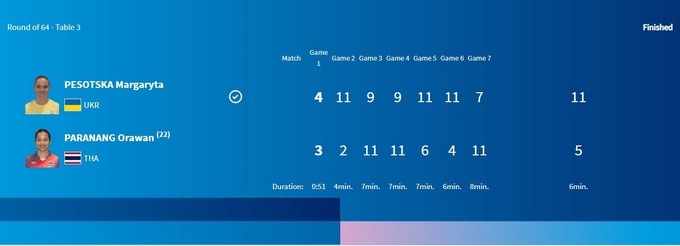 Маргарита Пісоцька – Ораван Парананг [22] – 4:3 (11:2, 9:11, 9:11, 11:6, 11:4)