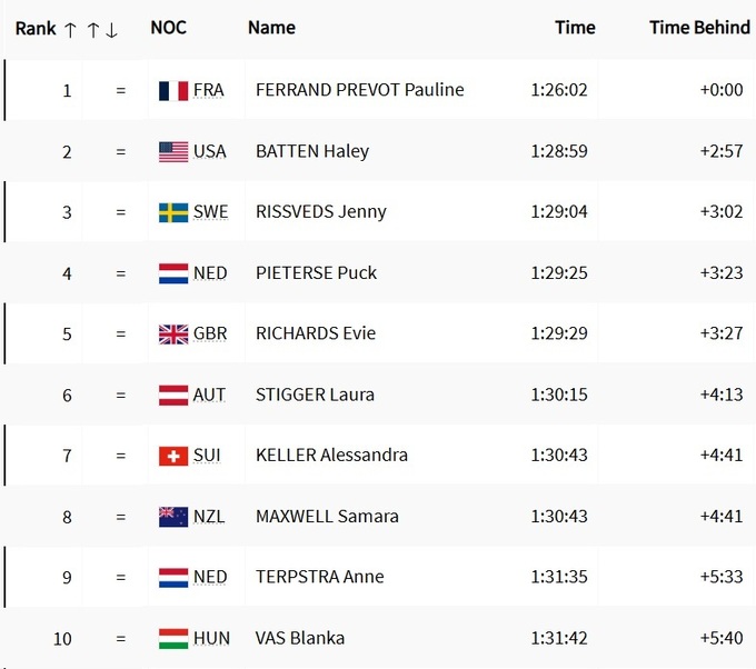 Золото виборола господиня змагань, француженка Полін Ферран-Прево. Вона випередила американку Хілі Баттен і шведку Єнні Ріссведс.