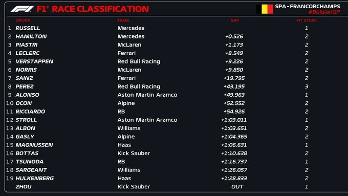 Відбулася гонка Формули-1 у рамках Гран-прі Бельгії. Виграв пілот Мерседеса Джордж Расселл, який стартував лише шостим, але провів неймовірну гонку.
