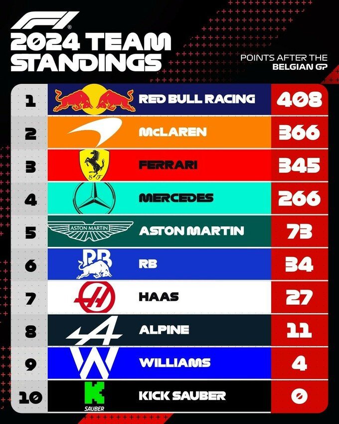 У Биків з'явилися проблеми у повільних поворотах та на нерівних трасах з високими поребриками. Команда привезла великі оновлення до Угорщини, але поки що чинний чемпіон не повернув собі звичну перевагу. Навіть у Спа, де Ред Булл традиційно домінує, Ферстаппен не показував неймовірний темп і не був швидшим за суперників з Макларена чи Мерседеса. У гонку за пілотський титул уже ніхто не вірить, але у боротьбі за Кубок конструкторів Ред Булл точно не може дозволити собі заспокоїтись.