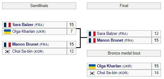 У півфіналі українка Ольга Харлан програла Саре Бальцер із Франції (7:15), а Манон Брюне із Франції завдала поразки Чой Себін із Південної Кореї (15:12).