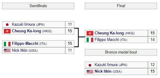 Чюн Ка Лун (Гонконг) був першим в індивідуальних змаганнях рапіристів. У фіналі він переміг італійця Філіппо Маккі (15:14). Цікаво, що Чюн Ка Лун став дворазовим олімпійським чемпіоном, повторивши токійський успіх.