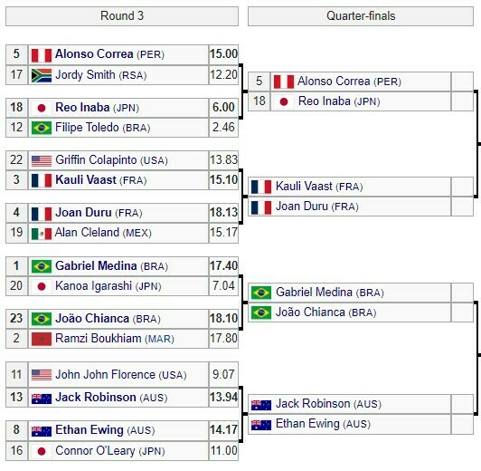 Бразильський серфінгіст Габріель Медіна (Gabriel Medina) встановив олімпійський рекорд (9,9 бали) у поєдинку проти японського спортсмена Каноа Ігарасі і вийшов до 1/4 фіналу.