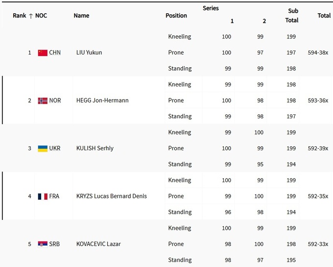 Він показав третій результат, набравши 592 бали з 600 можливих. До фіналу відібралися 8 найкращих спортсменів.