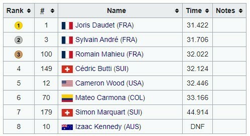 Французьке тріо лідирувало зі старту перед домашньою публікою на стадіоні BMX у Сен-Кантен-ан-Івелін. Першим фінішував Жоріс Доде, здобувши золото (31.422 сек). За ним йшов Сільвен Андре, у нього срібло (31.706 сек), а Ромен Майє завоював бронзу (32.022 сек).