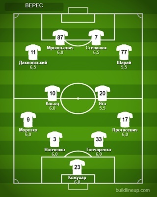 Верес: Кожухар – Протасевич (Гакман, 85), Гончаренко, Вовченко, Морозко, Кльоц (Кучеров, 65), Яго, Шарай, Дахновський (Годя, 85), Степанюк, Мрвальєвич (Гайдучик, 70).