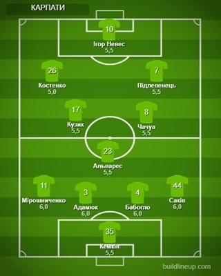 Карпати: Кемкін – Саків (Полегенько, 57), Бабогло, Адамюк, Мірошниченко, Альварес (Клименко, 84), Кузик (Шах, 90), Чачуа, Костенко, Підлепенець (Стеніо, 90), Невес (Сидун, 90).