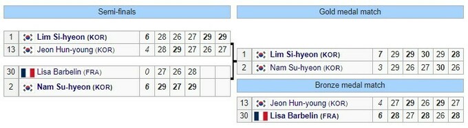 В індивідуальних змаганнях у стрільбі з лука у жінок золоту медаль здобула Лім Сі Хьон, яка у фіналі перемогла співвітчизницю Нам Сі Хьон.