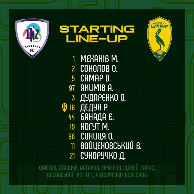 «Лівий берег»: Механів – Дударенко, Самар, Якимів, Соколов – Дедух, Банада – М. Когут (Ів. Когут, 65), Синиця (Галас, 74), Войцеховський (Астахов, 73) – Сухоручко (Колесник, 74).
