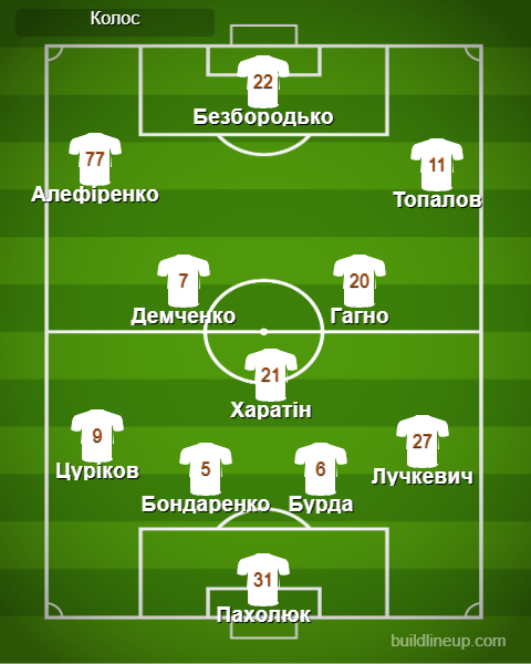 «Колос»: Пахолюк – Лучкевич, Бурда, Бондаренко, Цуріков – Гагно, Харатін (Оріховський, 62), Демченко – Топалов (Третьяков, 62), Безбородько (Паулаускас, 62), Алефіренко (Велетень, 69)