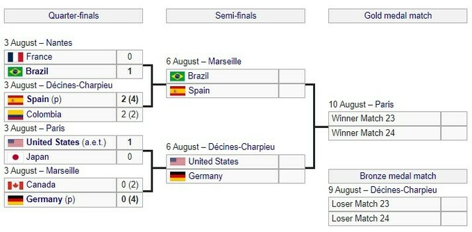 У півфіналах 6 серпня зіграють: Бразилія – Іспанія, США – Німеччина.