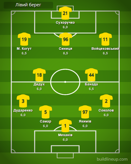 «Лівий берег» (заміни): І. Когут – 6,0, Галас – 6,0, Колесник – 5,5, Астахов – 6,0.