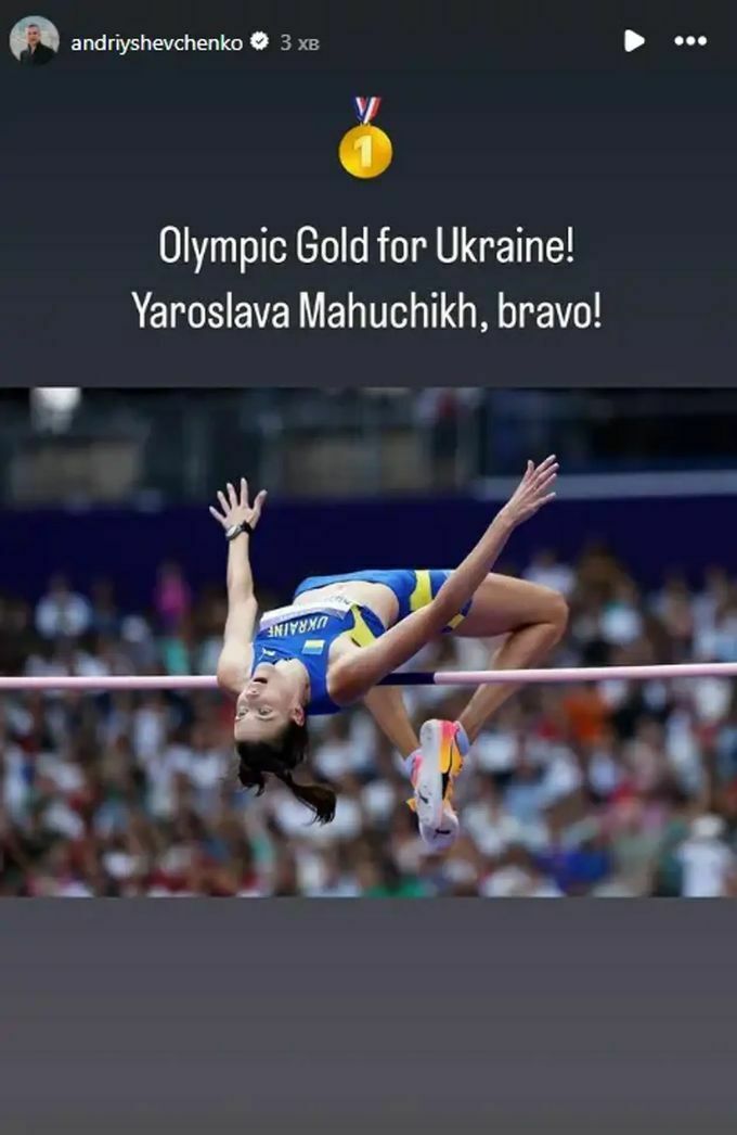 «Олімпійське золото для України! Ярослава Магучіх, браво», – написав президент УАФ.