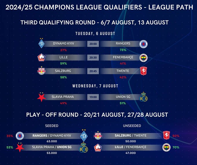 Київське Динамо дізнається потенційного суперника в Q4 Ліги чемпіонів за Шляхом представників ліг. Кияни зіграють у 4-му раунді ЛЧ, якщо обіграють Рейнджерс (Шотландія) у Q3. Динамо матиме сіяний статус у Q4.