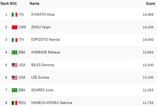 Золото виборола італійка Аліса Д'Амато – 14.366. Срібло у Чжоу Яцінь (14.100) із Китаю, а бронзу взяла ще одна представниця Італії Маніла Еспозіто (14.000).