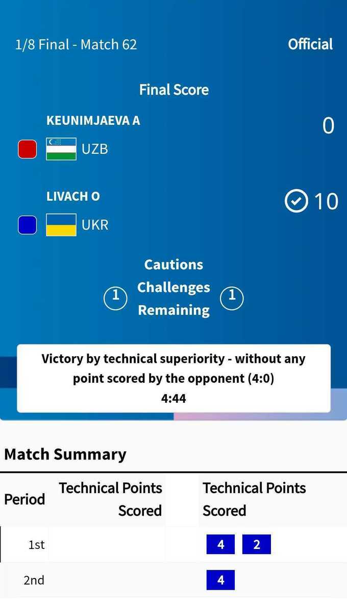 В 1/8 фіналу суперницею українки була Актенге Кеунімжаєва з Узбекистану. Лівач здолала суперницю за технічною перевагою – без жодного набраного очка з боку суперниці (10:0).
