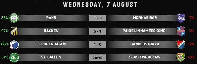 Домашні перемоги здобули Копенгаген (Данія), Пакш (Угорщина), Санкт-Галлен (Швейцарія).