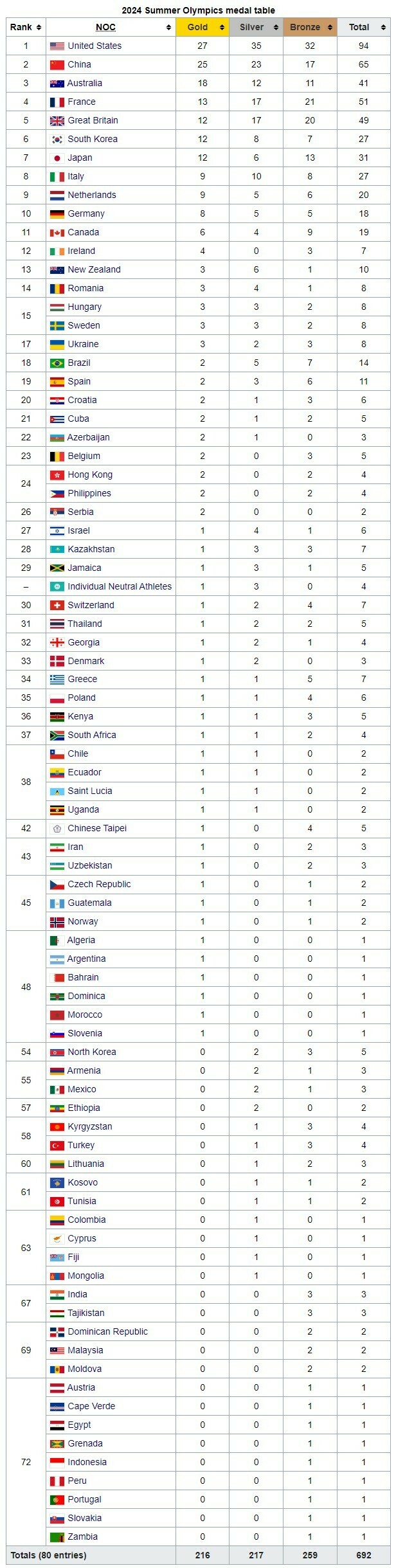 У медальному заліку утримує лідерство команда США (27–35–32). До топ-5 також входять Китай (25–23–17), Австралія (18–12–11), Франція (13–17–21), Великобританія (12–17–20).