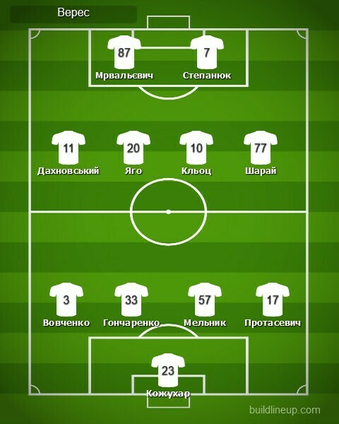 «Верес»: Кожухар, Протасевич (Гакман, 46), Мельник (Луан, 80), Вовченко, Яго, Кльоц (Кучеров, 46), Гончаренко, Дахновський (Світюха, 74), Шарай, Степанюк, Мрвальєвич (Гайдучик, 46)