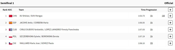 У першому півфінальному заїзді китаянки Сюй Шисяо і Сунь Менья оновили олімпійський рекорд на цій дистанції – 1:53.73.