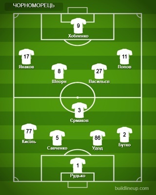 «Чорноморець»: Рудько, Кисіль (Арсіч, 74), Єрмаков, Бутко, Удод, Савченко (Лотоцький, 88), Васильєв (Габелок, 54), Шпорн (Калин, 74), Янаков (Пшеничнюк, 54), Хобленко, Попов.