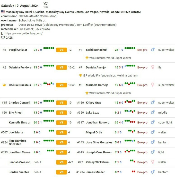 На ринг вийдуть українець Сергій Богачук (24–1, 23 KO) та американець Вірджіл Ортіс (21–0, 21 KO).