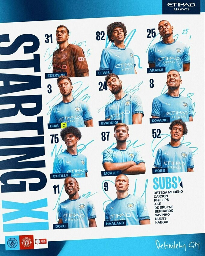«Манчестер Сіті»: Едерсон, Льюїс, Аканджі, Діаш, Гвардіол, Ковачич, О'Райлі, Макеїті, Бобб, Доку, Голанд.