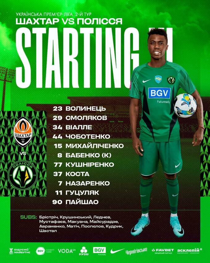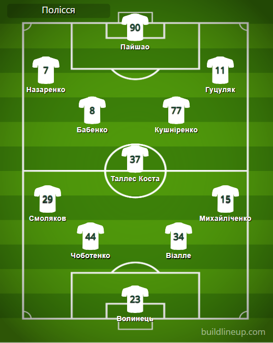 «Полісся»: Волинець – Смоляков, Чоботенко, Віалле, Михайліченко – Бабенко, Таллес Коста (Шастал, 65), Кушніренко (Крушинський, 18) – Назаренко (Лєднєв, 66), Пайшао (Брістрич, 46), Гуцуляк (Макуана, 73).