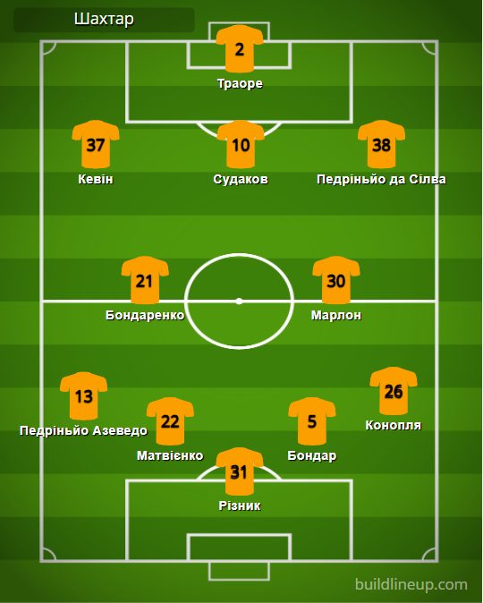 «Шахтар»: Різник – Педріньйо Азеведо (Егіналду, 62), Матвієнко, Бондар, Конопля – Бондаренко, Марлон (Степаненко, 23) – Кевін (Невертон, 81), Судаков, Педріньйо да Сілва (Швед, 46) – Траоре (Сікан, 46).