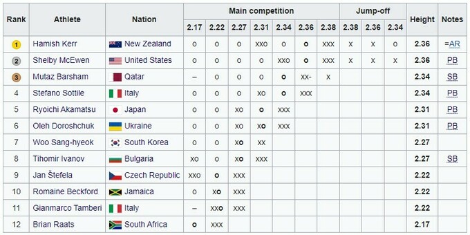 Додатковий міні-турнір знадобився, щоб визначити володаря золотої нагороди у стрибках у висоту. У перестрибуванні чемпіоном став Хемміш Керр із Нової Зеландії, який здолав Шелбі Макьюена зі США). Обидва взяли 2.36 м із рівною кількістю невдалих спроб. У перестрибуванні вони не зуміли повторити цей результат, і планку було знижено до 2.34 м. Фортуна посміхнулася спортсмену з Нової Зеландії.