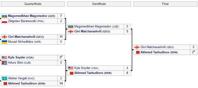 У ваговій категорії до 97 кг Ахмед Тажудінов із Бахрейну виграв у фіналі у грузинського спортсмена Гіві Мачарашвілі.