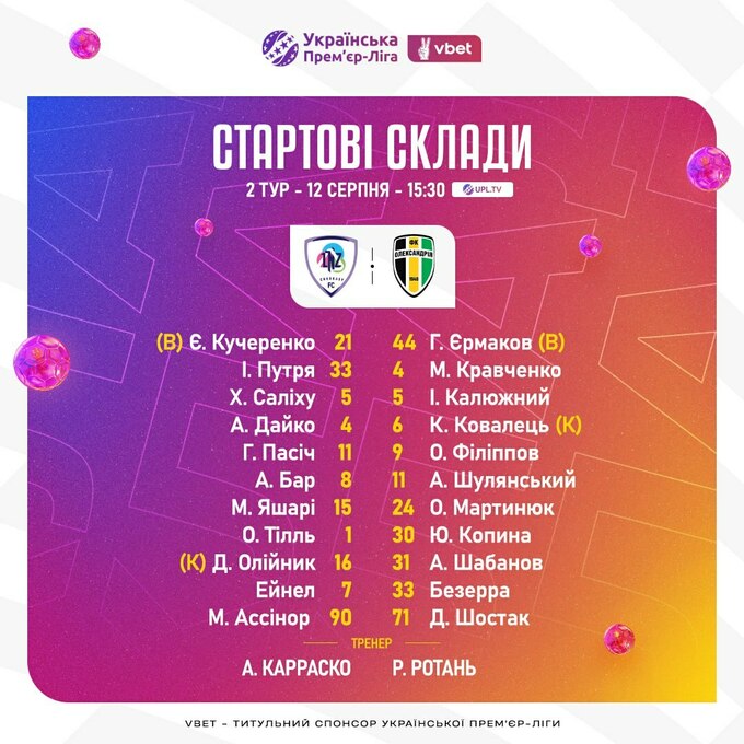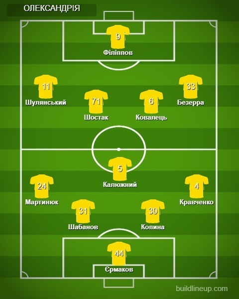 Олександрія: Єрмаков – Мартинюк, Шабанов, Копина, Кравченко (Кампос, 65), Калюжний, Ковалець (Мишньов, 77), Шостак (Смирний, 65), Шулянський, Філіппов (Погорілий, 77), Безерра (Авагімян, 85).