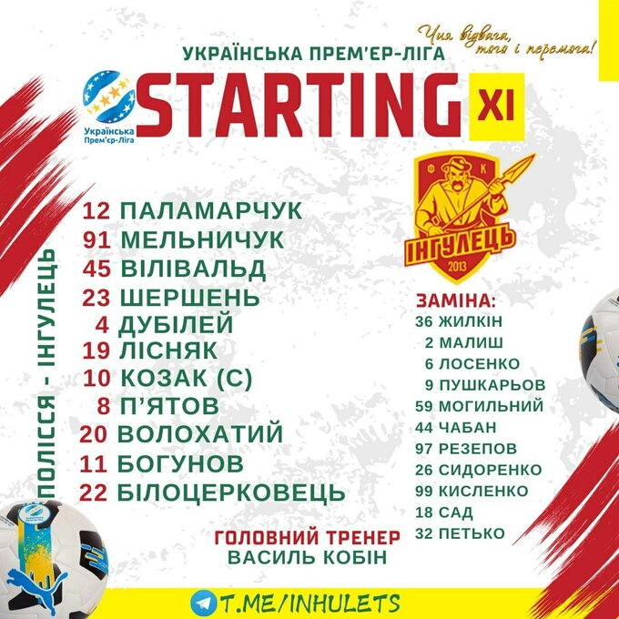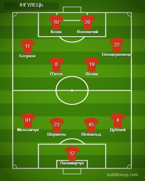 Інгулець: Паламарчук – Вілівальд, Шершень, Дубілей (Сидоренко, 83), Мельничук, Лісняк (Петько, 63), П’ятов, Білоцерковець (Резепов, 88), Богунов (Пушкарьов, 63), Волохатий (Сад, 83), Козак.
