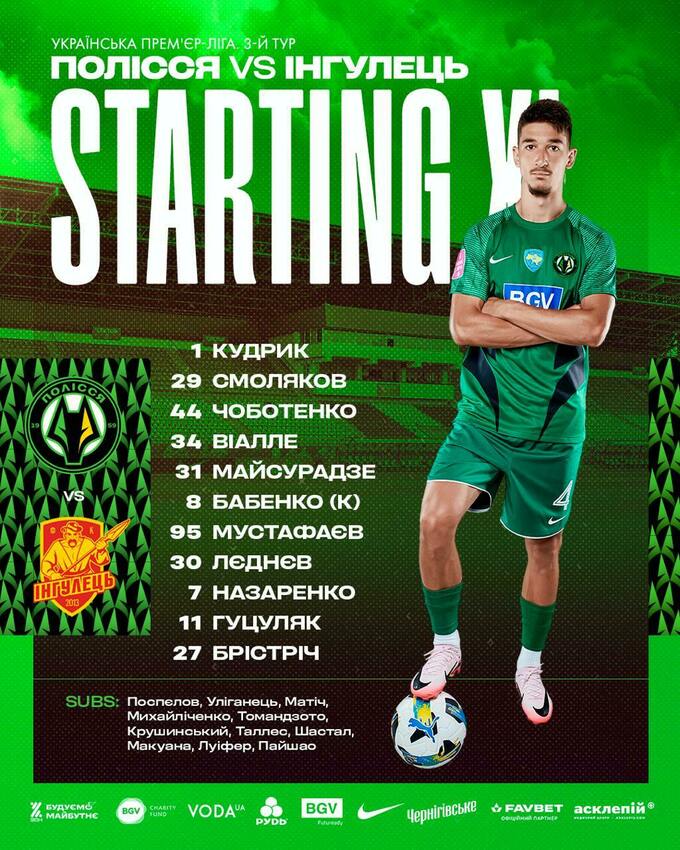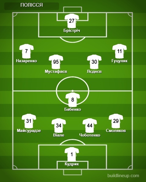 Полісся: Кудрик – Чоботенко, Віалле, Смоляков, Майсурадзе (Михайліченко, 46), Бабенко, Мустафаєв (Луіфер, 79), Лєднєв (Крушинський, 46), Гуцуляк, Назаренко (Макуана, 72), Брістріч (Пайшао, 61).