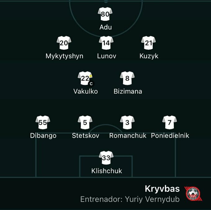 Кривбас: Кліщук, Дібанго, Стецьков, Романчук, Понєдєльнік, Бізімана, Вакулко, Микитишин, Луньов, Кузик, Прінс Аду