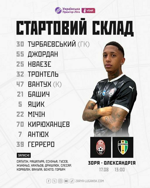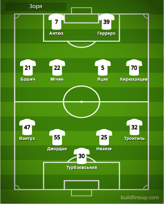 «Зоря»: Турбаєвський – Вантух (Жуніньйо, 46), Джордан, Нваезе (Вакула, 63), Тронтель – Башич, Мічин (Дришлюк, 46), Яцик, Кирюханцев (Кораблін, 63) – Антюх, Герреро (Горбач, 78).