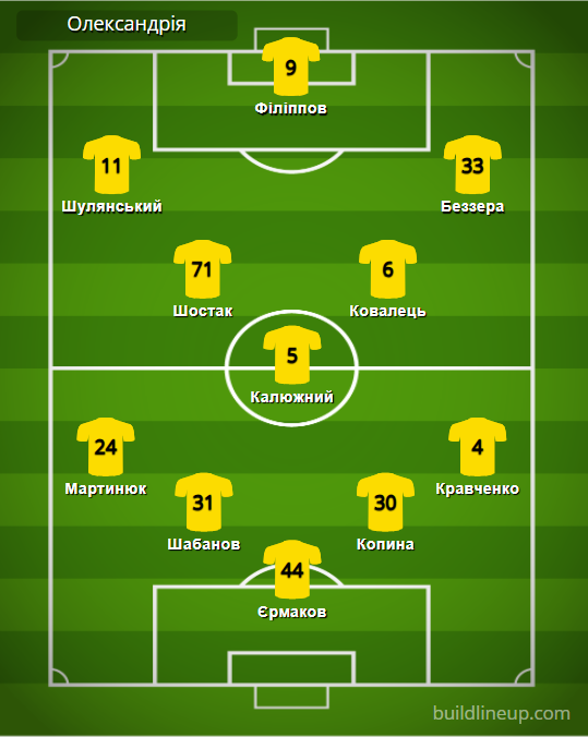 «Олександрія»: Єрмаков – Мартинюк, Шабанов, Копина, Кравченко (Кампуш, 71) – Шостак (Мишньов, 66), Калюжний, Ковалець (Смирний, 46) – Шулянський (Костишин, 71), Філіппов (Погорілий, 84), Беззера.