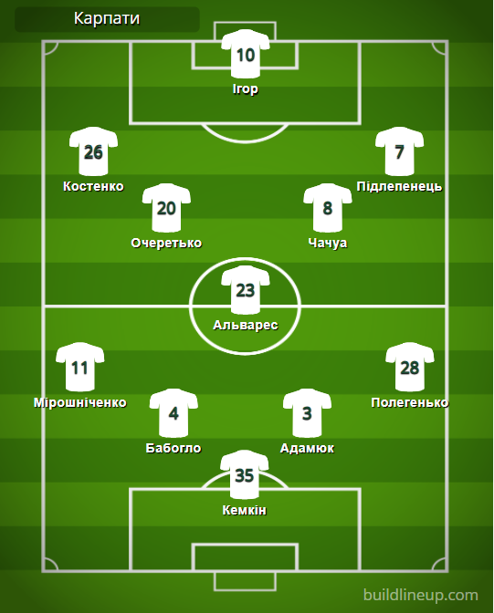 «Карпати»: Кемкін – Мірошніченко, Бабогло, Адамюк (Педросо, 90+1), Полегенько – Очеретько, Альварес, Чачуа (Шах, 63) – Костенко (Кузик, 46), Ігор (Устименко, 63), Підлепенець (Занетті, 63).
