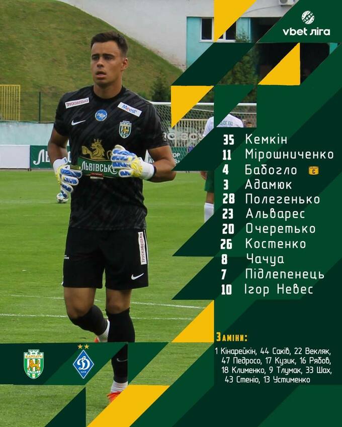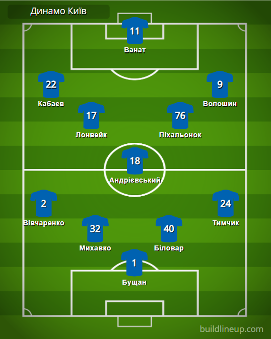 «Динамо» Київ: Бущан – Вівчаренко, Михавко, Біловар, Тимчик (Малиш, 90+3) – Лонвейк (Шапаренко, 46), Андрієвський (Михайленко, 82), Піхальонок – Кабаєв (Брагару, 73), Ванат, Волошин (Ярмоленко, 73).