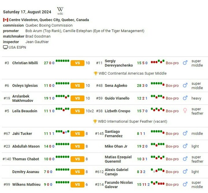- Крістіан Мбіллі (27–0, 23 KO) – Сергій Дерев'янченко (15–5, 10 KO)